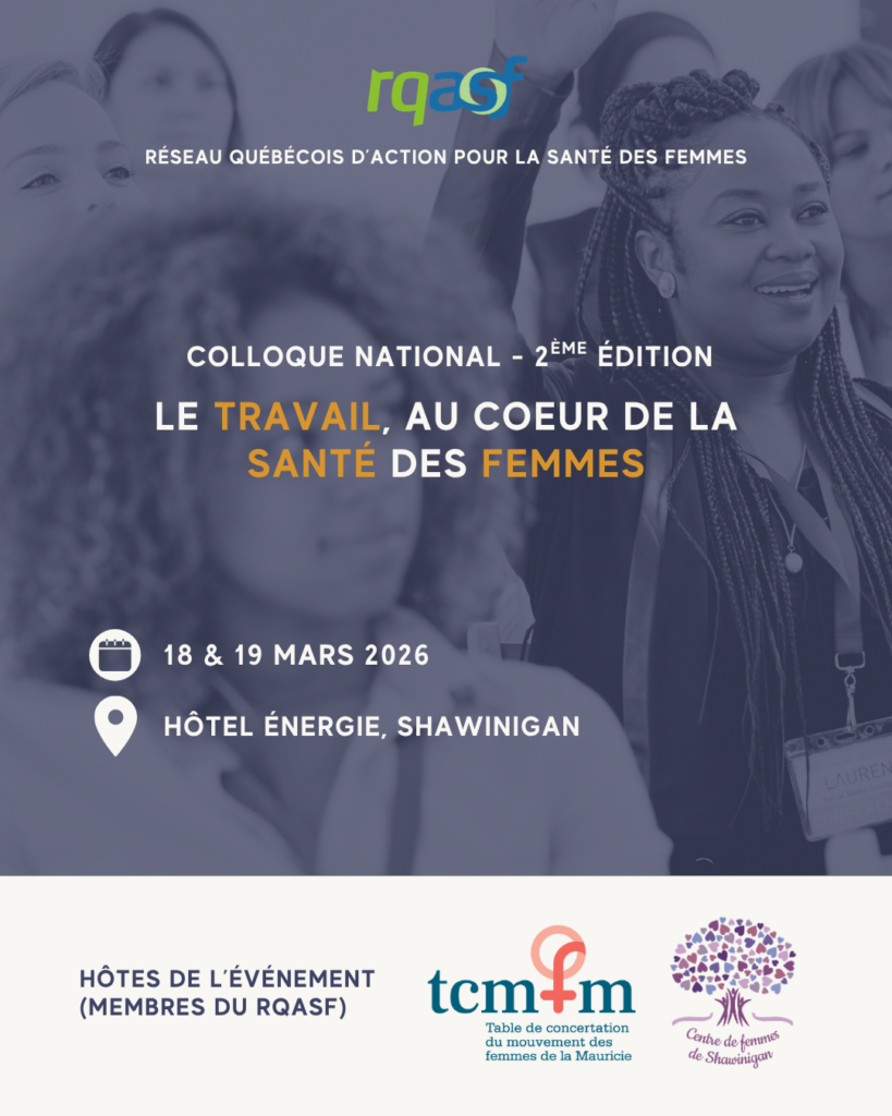 Le Réseau québécois d’action pour la santé des femmes (RQASF) organisera les 18 et 19 mars 2026 à Shawinigan son 2ème Colloque national sur la santé des femmes, sur le thème « La santé, au coeur du travail des femmes ».